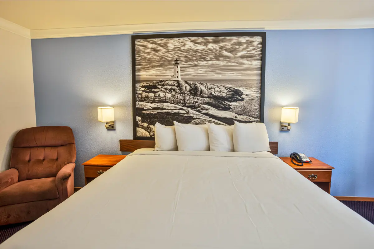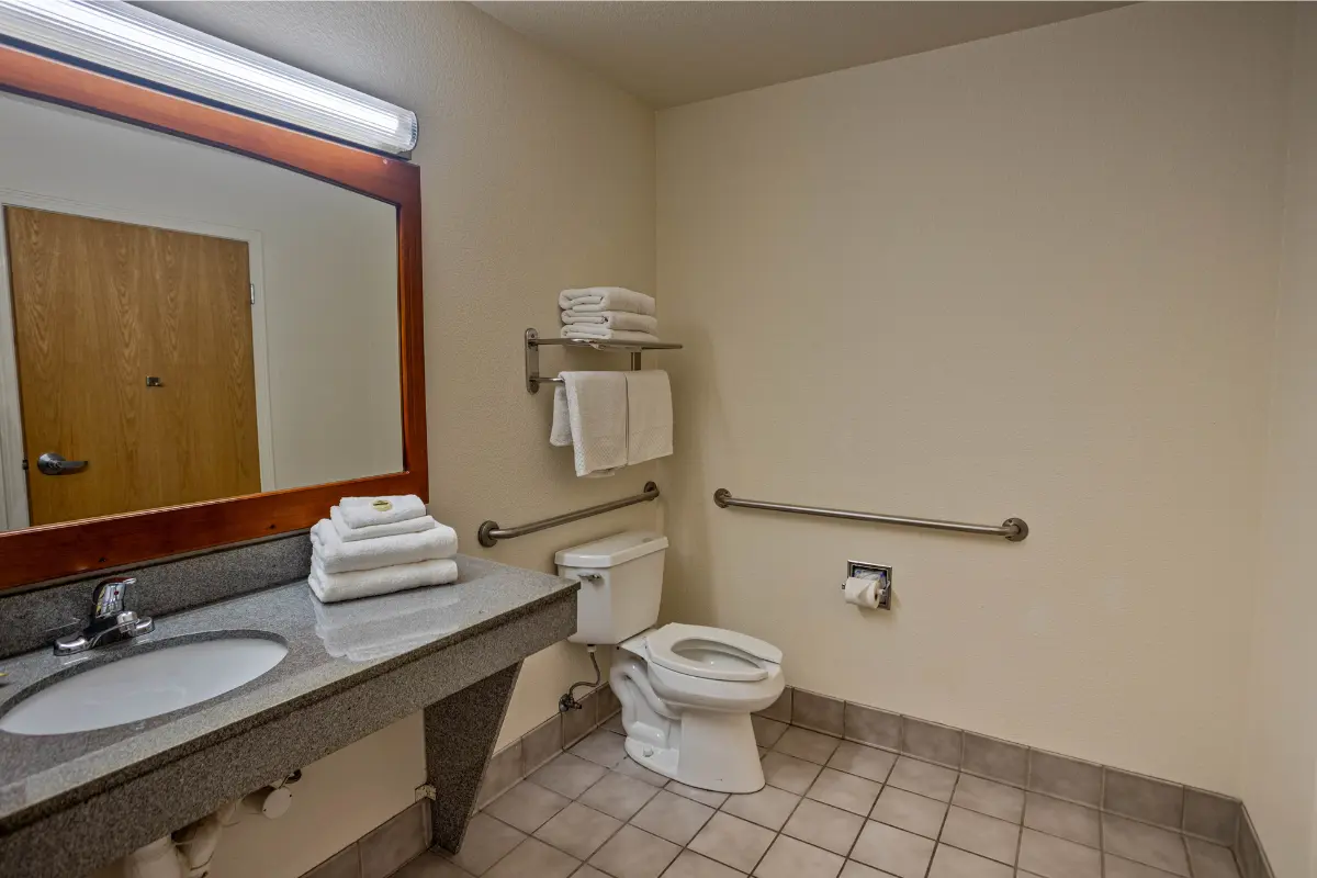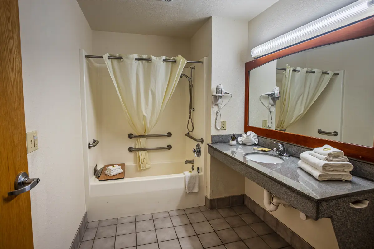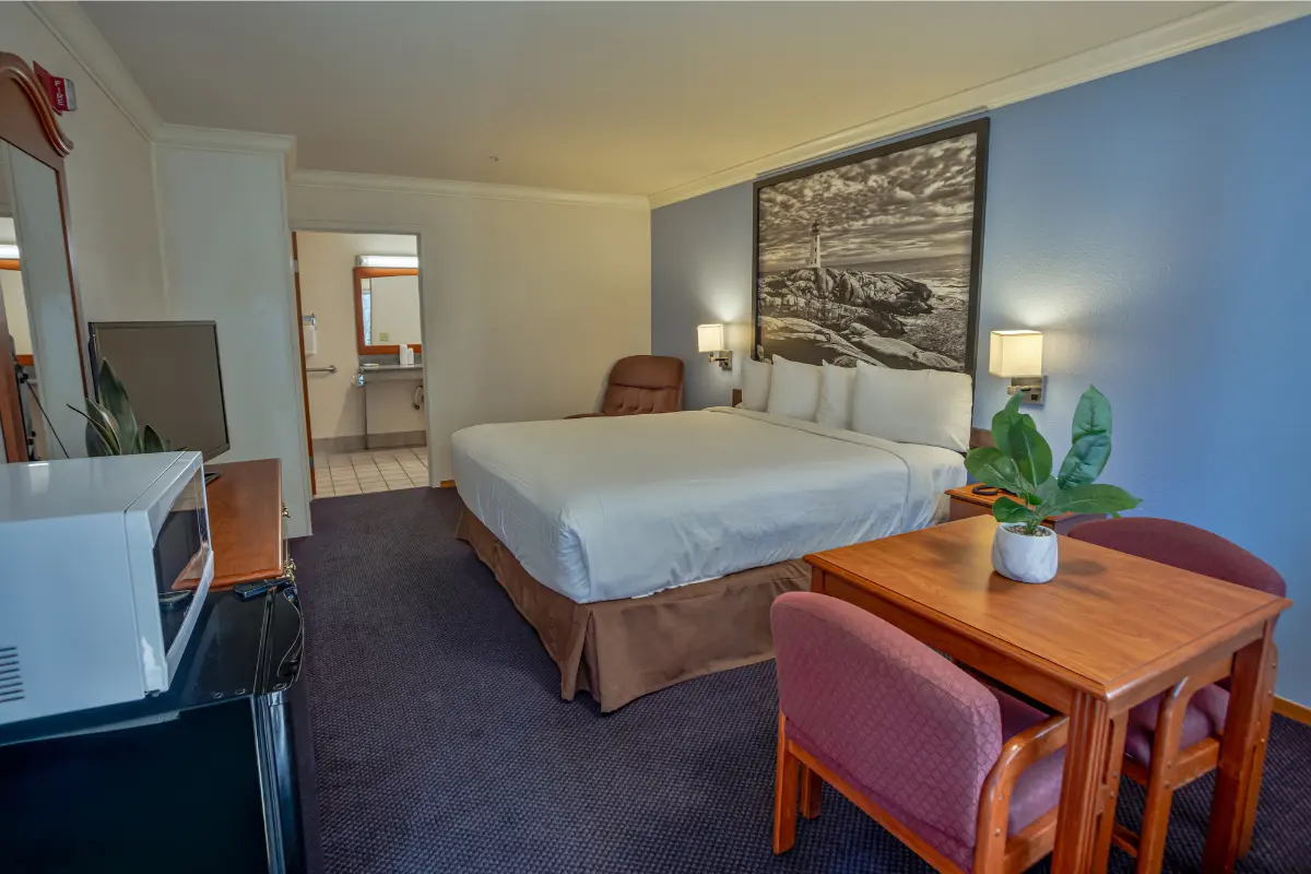 Designed with your comfort in mind, this 225 sq ft accessible room offers a plush king bed and a welcoming layout. The ADA-compliant bathroom features grab bars and an accessible tub, while modern amenities like a flat-screen TV, complimentary Wi-Fi, a mini-refrigerator, and a microwave make your stay effortless.