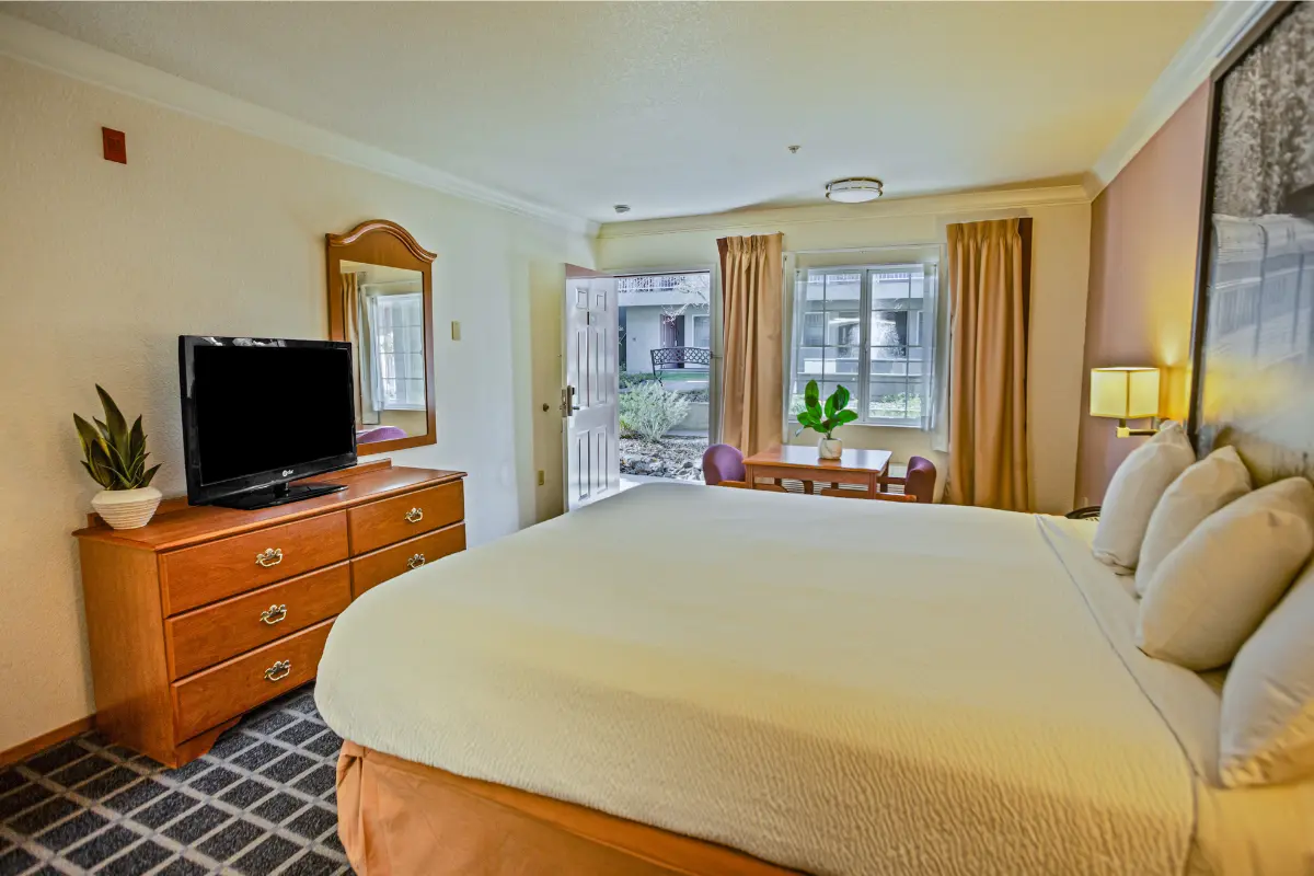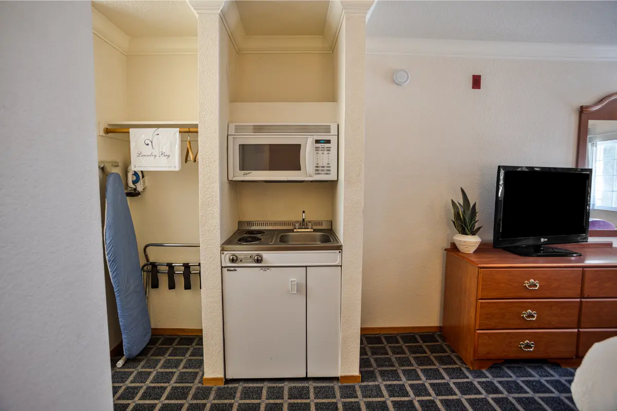 Offering the comfort of a king-size bed in a spacious 225 sq ft room, this option includes a convenient kitchenette equipped with a microwave, refrigerator, and stove top for preparing simple meals. Additional features include a flat-screen TV, complimentary Wi-Fi, and a private bathroom with toiletries and a hairdryer.